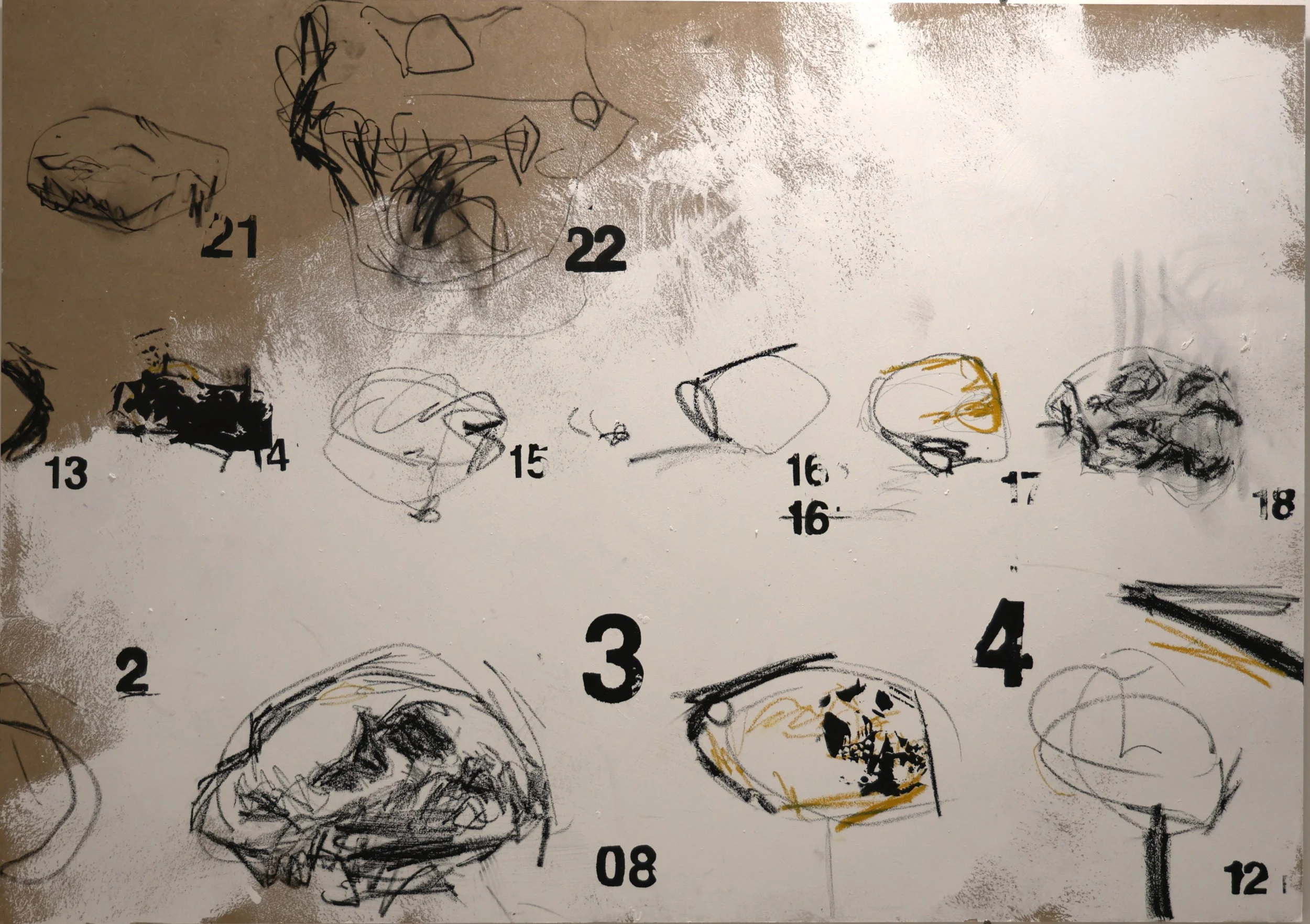 The last exhibition Acrylic paint, multi media on wooden board, 2025Glimpse