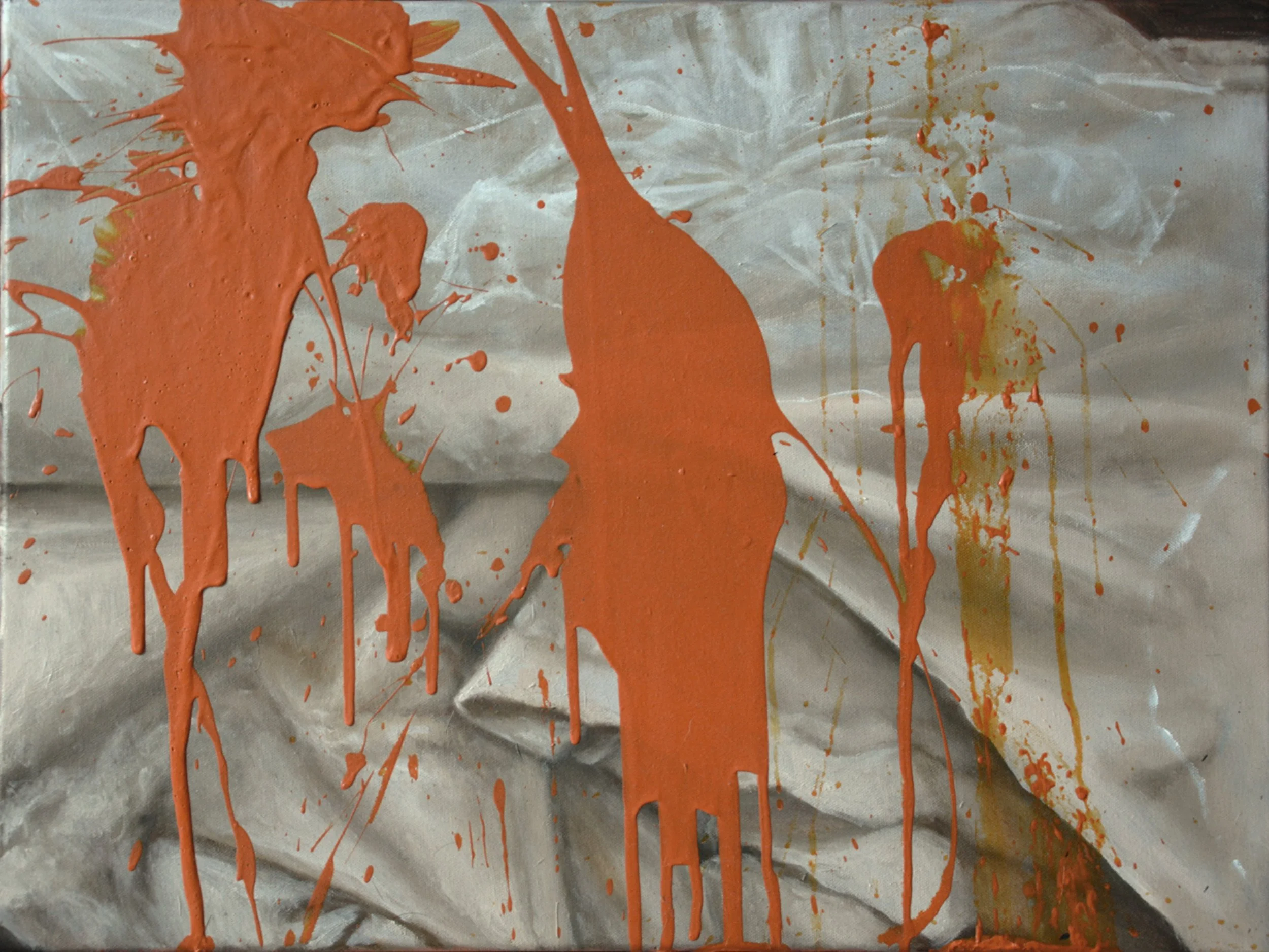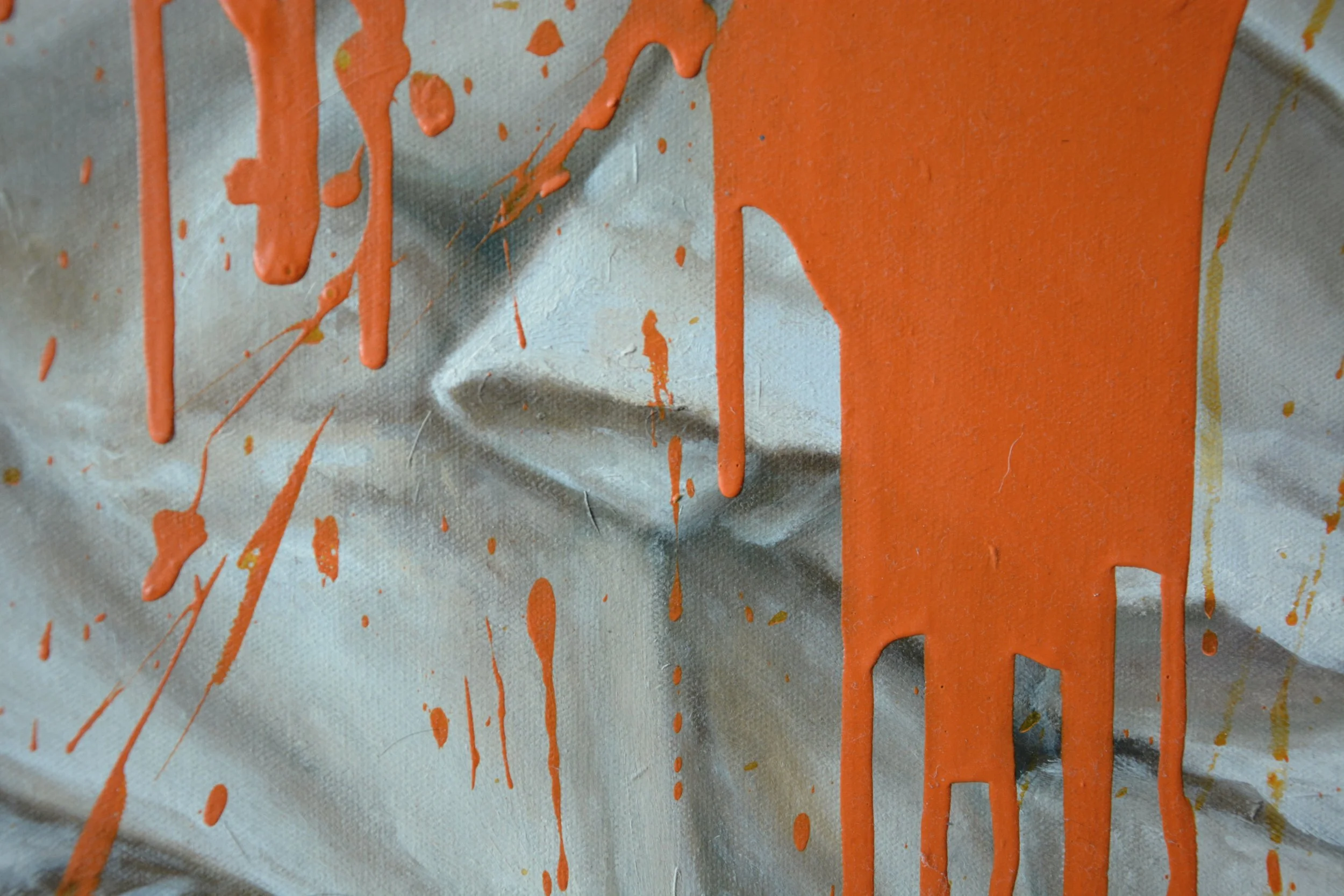 The aim of creating this piece is to ask questions. Splashes of orange paint creates a brand new tune and taste to the original, traditional drapery painting. This painting asks the question whether the use of medium that doesn’t require control nor skill defile the painting, or the act of ‘destroying’ and ‘ruining’ the painting elevates the artwork itself? Since the act challenges an artist’s work ethics while creating contrast between precision and wildness on the same canvas. A photo of the painting was taken before it was stained which raises the third question, are the two previous debates too small to matter since a near perfect replica of the intended outcome already exists? I was inspired to create this piece as a debate and an observation; in the era which the skill to create and an artist’s participation in the artworks are often weak in their presence or dismissed altogether, and majority appreciate an artwork from what it says rather than what it is.