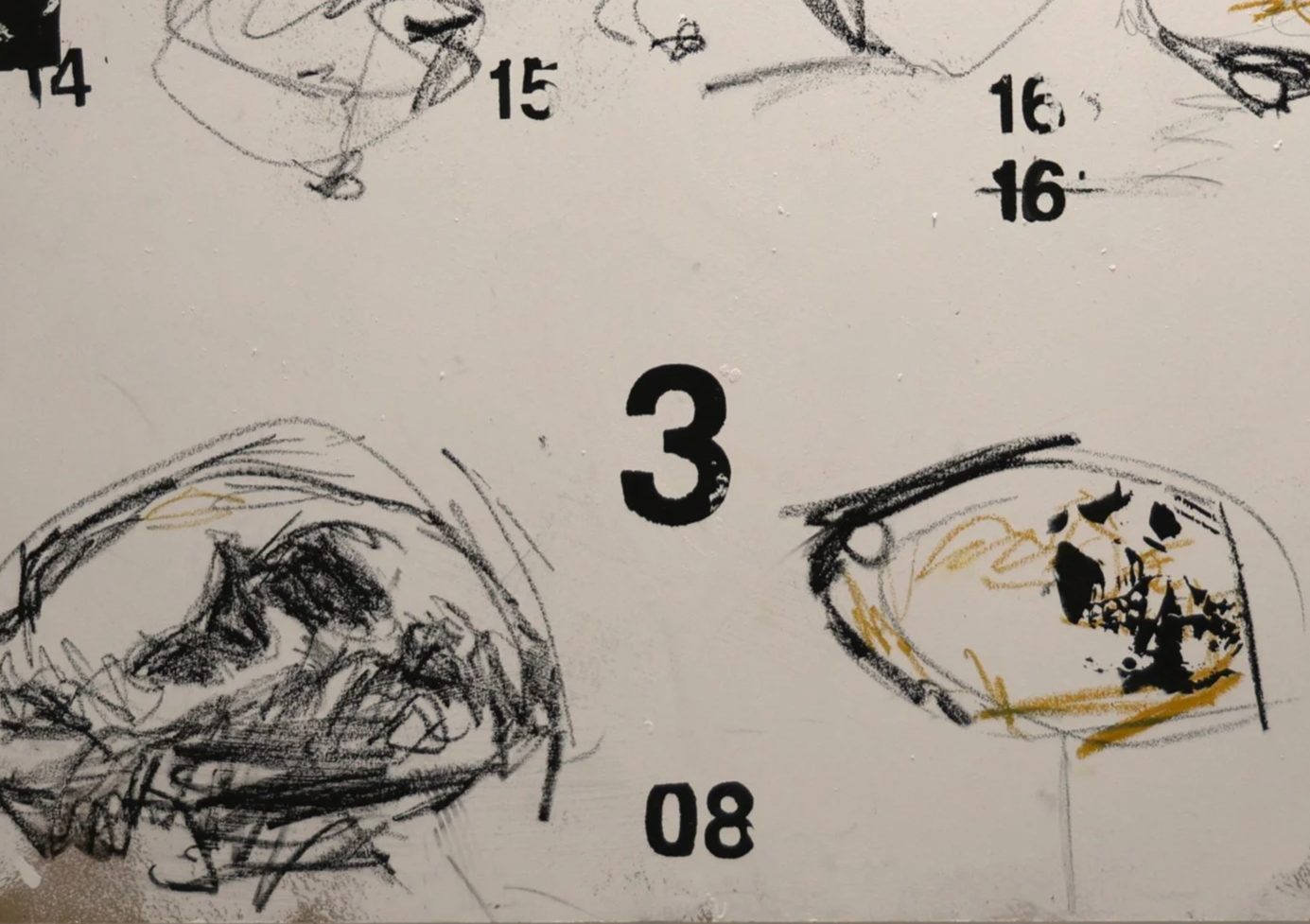 Initial introduction to the use of numbers and pattern to the series of bones artwork, inspired by the labeling with numbers, linking each sample to its corresponding stories in a real history museum. I was drawn by the power of composition, form and the idea of ‘indication’ through those arranged numbers, and attempted to bring attention to numbers to this piece by simplifying, or rather conceptualize the actual exhibits in the piece to juxtapose the solid, defined numbers.
