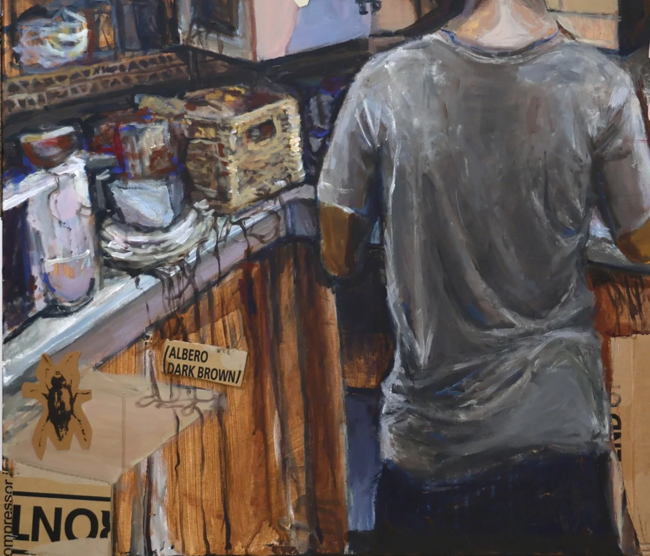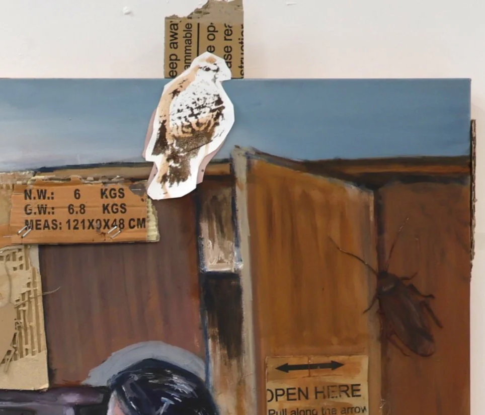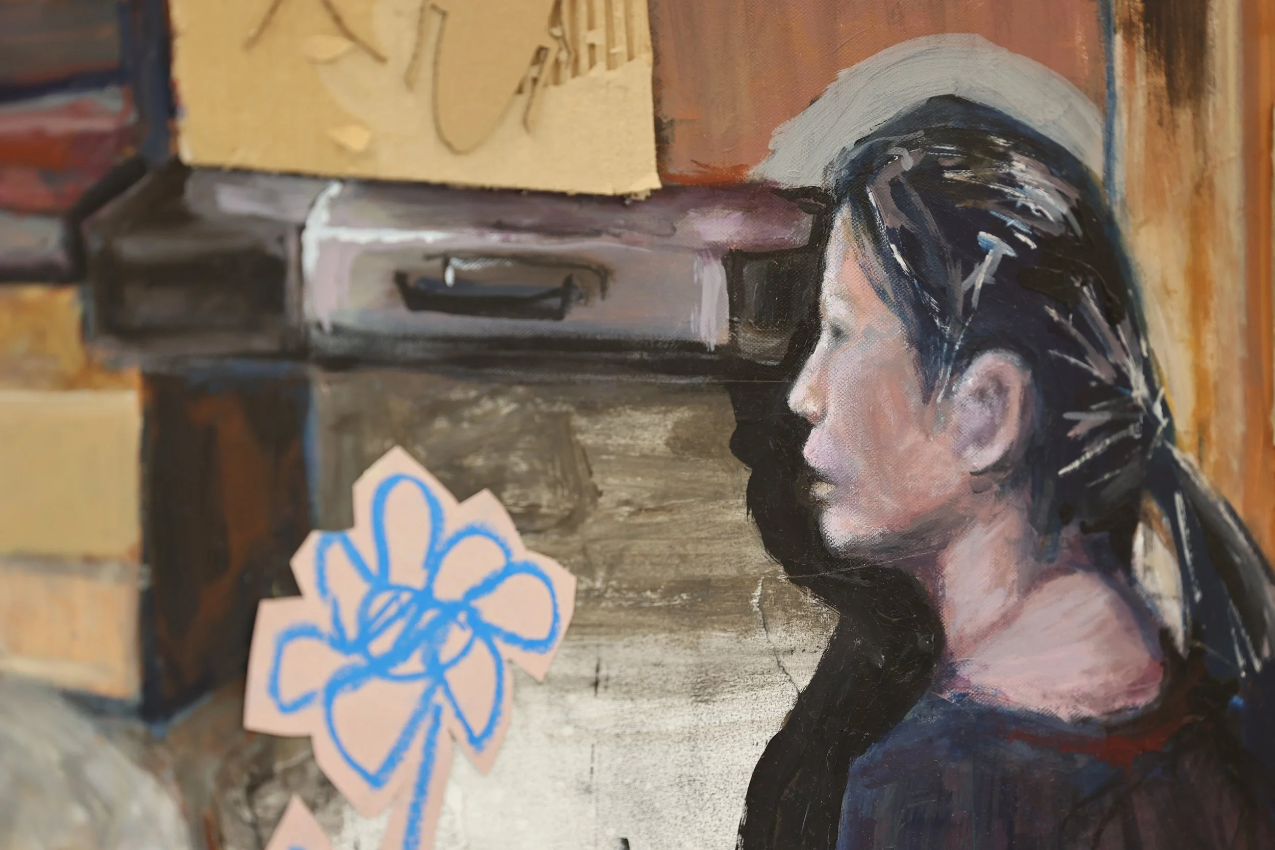 Acrylic paint, collage of screen print, cardboard and oil pastel drawing on canvas